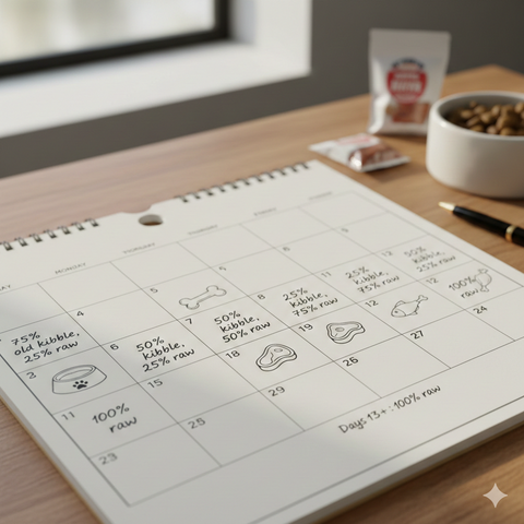 - Days 1–3: 75% old kibble, 25% raw